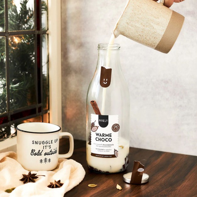 Quand le froid s’installe, rien de tel qu’un verre de chocolat chaud qui réchauffe le corps et le cœur. La Carafe Chocolat Chaud de Pineut vous propose un mélange gourmand : chocolat noir riche mélangé à des épices comme la cannelle, l’anis étoilé, la cardamome et le clou de girofle. Versez le contenu dans du lait de votre choix, chauffez doucement, et savourez ce moment douillet.