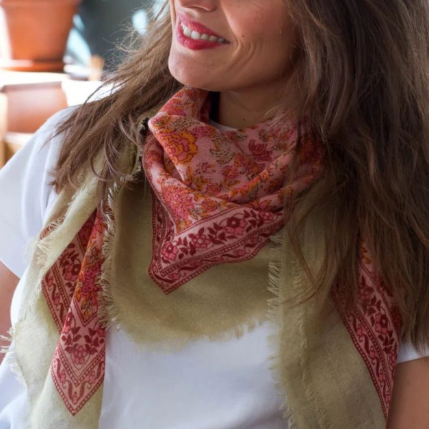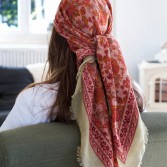 Laissez-vous envelopper par la douceur et l’élégance du foulard Ouna. Grand carré en 100 % laine, imprimé à la main avec la technique traditionnelle du blockprint, ce foulard possède un toucher peau de pêche qui réchauffe le cou tout en apportant une touche bohème à votre tenue.