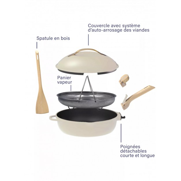 La Fabuleuse de Cookut remplace 8 ustensiles en 1 : poêle, sauteuse, cocotte, cuiseur vapeur, plat au four, friteuse, moule à gâteau… et plus encore. Idéale pour 1 à 8 personnes. Légère mais robuste, elle est conçue en métal recyclé avec un revêtement antiadhésif sans PFOA ni PFAS. Les poignées sont amovibles, le couvercle dispose d’un système auto-arrosant, et un panier vapeur est inclus pour cuire sainement à la vapeur. Compatible tous feux (gaz, induction, vitro, électrique) et utilisable au four jusqu’à 240 °C (sans les poignées) elle passe également au lave-vaisselle.