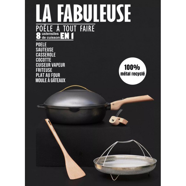 La Fabuleuse de Cookut remplace 8 ustensiles en 1 : poêle, sauteuse, cocotte, cuiseur vapeur, plat au four, friteuse, moule à gâteau… et plus encore. Idéale pour 1 à 8 personnes. Légère mais robuste, elle est conçue en métal recyclé avec un revêtement antiadhésif sans PFOA ni PFAS. Les poignées sont amovibles, le couvercle dispose d’un système auto-arrosant, et un panier vapeur est inclus pour cuire sainement à la vapeur. Compatible tous feux (gaz, induction, vitro, électrique) et utilisable au four jusqu’à 240 °C (sans les poignées) elle passe également au lave-vaisselle.