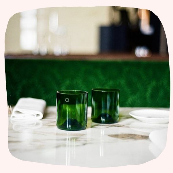 Sur notre table, on adore aussi nos verres Q de Bouteilles. Chaque pièce est créée à partir de bouteilles de vin upcyclées dans l’atelier du Touquet, en France. Ce qu’on adore ? Les teintes qui varient selon la bouteille d’origine : transparence parfaite, verts élégants, jaunes ou ambrés, aucun verre n’est tout à fait identique, et c’est ce qui les rend uniques. Et s’imaginer à quelle occasion les bouteilles de vin ont été bues, les tablées pleines de rires et les dîners romantiques qu’elles ont accompagnés. Quand on les pose sur la table, les verres Q de Bouteilles attirent toujours un petit « Ooooh, c’est original ! » de la part de nos invités. Et ça, c’est tout ce qu’on demande : un bel objet, une belle histoire et un petit geste pour la planète (oui, récupérer plutôt que gaspiller !).