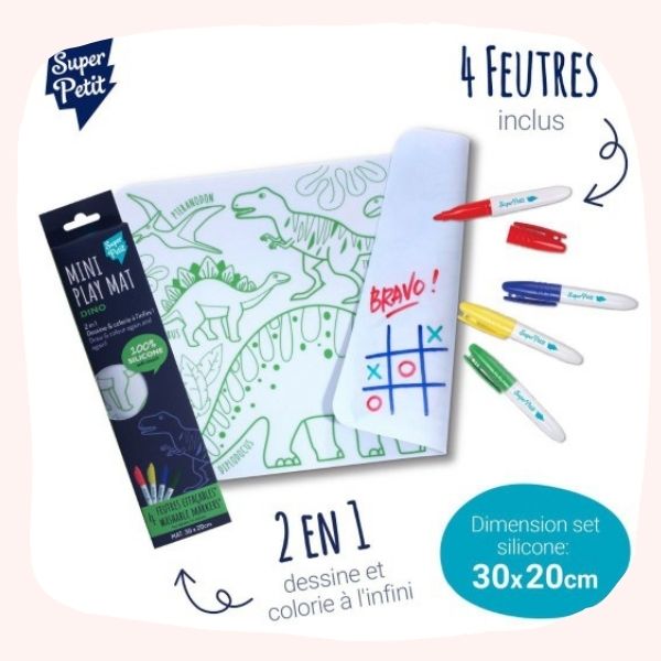 Un tapis en silicone, quatre marqueurs, infiniment effaçable: le combo parfait pour occuper les petites mains en voiture, en resto, ou pendant que les adultes papotent un peu trop longtemps.