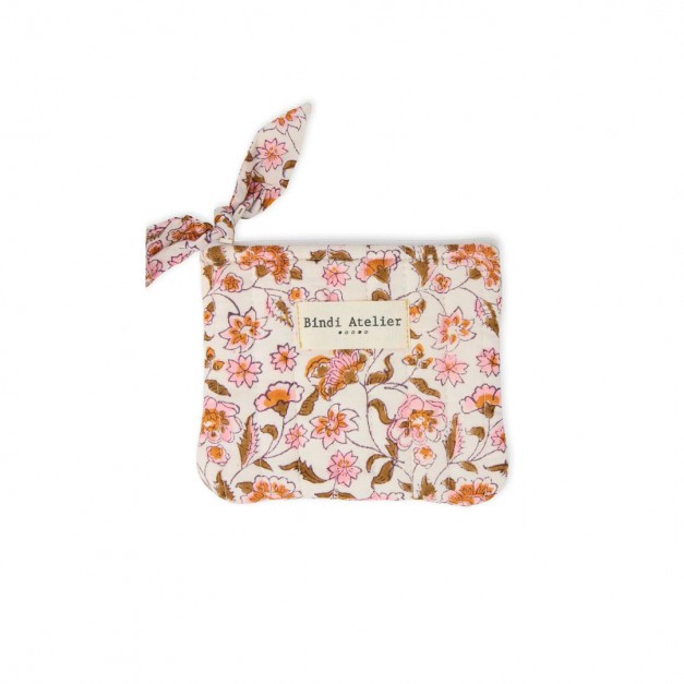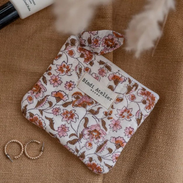 Son tissu matelassé, imprimé à la main au bloc de bois dans un atelier familial à Jaipur, lui donne un caractère artisanal et unique. Avec sa fermeture éclair ornée d’un nœud, il ajoute une touche féminine et raffinée à vos accessoires du quotidien.