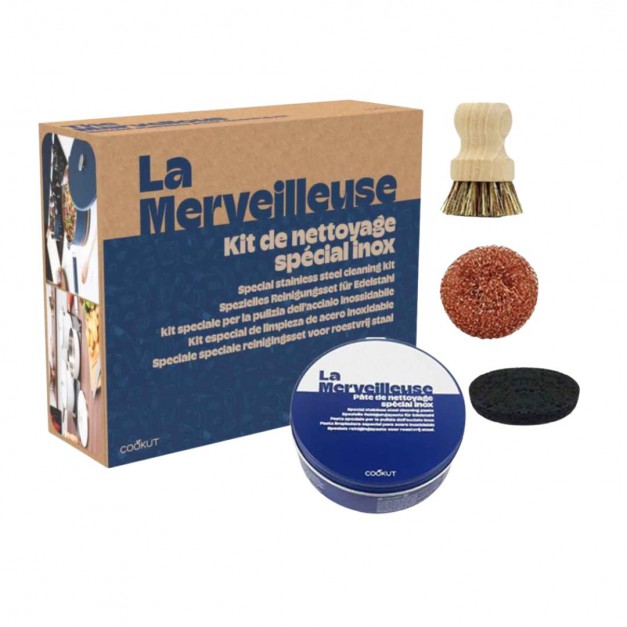 Ce kit nettoyage a été conçu pour raviver la splendeur des casseroles, poêles et ustensiles en acier inoxydable. Il offre une solution complète qui nettoie, polit et protège sans altérer la surface. Élégant dans sa boîte, il mêle efficacité et douceur pour l’inox. Utilisable sur toute la gamme La Merveilleuse ou tout ustensile en inox, ce kit redonne éclat et propreté à vos équipements de cuisson.